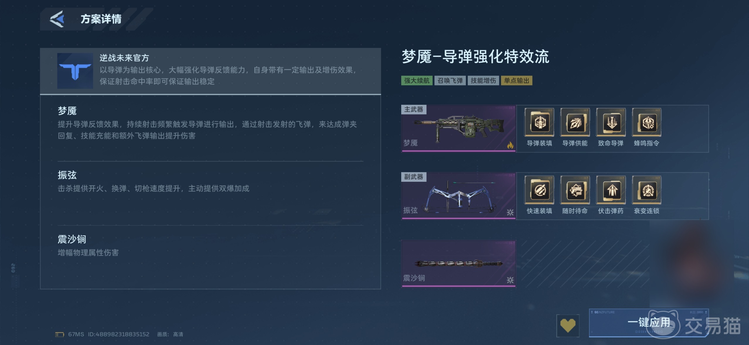 围绕“梦魇”的技能特性,主流养成方向聚焦于特效流构建:重点强化飞弹触发频率、增伤持续时间及整体续航稳定性。推荐配件组合为【导弹填装】【导弹供能】【知名导弹】【蜂鸣响应】,四者协同提升飞弹充能效率、发射数量与命中反馈速度。新手玩家可优先采用系统智能推荐装配方案,在熟悉机制后再逐步调整适配个人操作习惯。