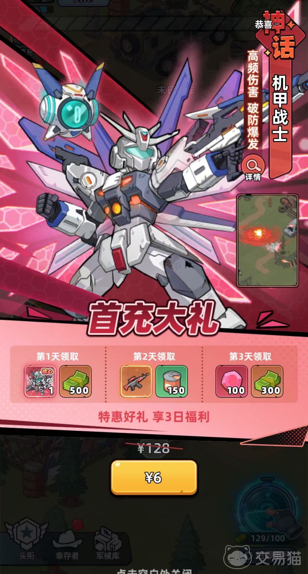 首推英雄为首发充值即得的机甲战士——该角色于开服首日仅需6元即可激活,属全服最早可入手的神话品质单位。次日与第三日还将额外解锁高阶武器及稀有道具,涵盖钻石与通用货币。其战斗定位为高频输出型物理/能量混合伤害角色:被动技能全局提升所有类型伤害;普攻附带追加伤害效果;主动技能发射穿透激光,具备破防与短暂减伤免疫双重机制;终极技能开启武装形态,持续自动倾泻弹幕,并以炮击类技能构建成体系化AOE输出链,整体压制力突出。