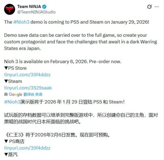 Team NINJA今日通过官方社交媒体宣布,动作角色扮演游戏《仁王3》的试玩版将于2026年1月29日登陆PlayStation5与Steam平台。