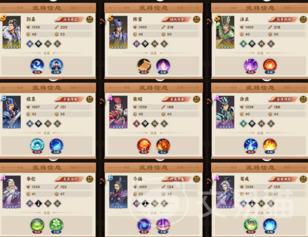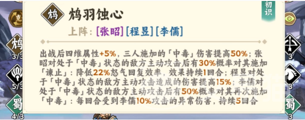 推荐主力搭配组合为:华佗、法正、郭嘉、徐庶、程昱。该五人可稳定支撑核心输出与生存循环。其中,郭嘉、法正、陈宫、徐庶、张昭、程昱六人构成标准六人羁绊组,攻击时随机选取三个目标,造成150%法术伤害,并附带6%概率眩晕效果;华佗、荀彧、李儒三人可激活“阳明羁绊”,提供全程持续治疗,显著降低战斗减员风险;张昭、程昱、李儒三人则组成“毒策羁绊”,使中毒类效果伤害提升50%,强化控制链衔接效率。