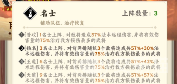 名士阵容的核心竞争力源于其多层级羁绊设计:单名士上阵即可通过普攻打出57%法术远程伤害,并将所造成伤害的75%转化为自身及友方生命恢复;当阵容中名士数量达3人时,激活基础羁绊,全体名士法术伤害提升30%;升至6人则解锁“王道羁绊”,法术伤害再增42%,同时获得群体治疗与范围输出双重增益;集齐9位名士后触发“天道羁绊”,额外提供57%法术伤害加成。所有名士武将均可通过游戏内活动或系统赠送直接获取,无需抽卡或付费兑换。