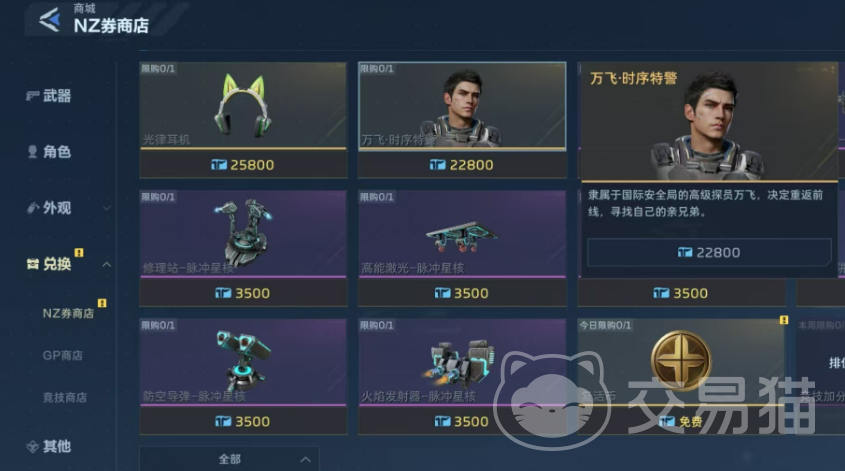 万飞时序特警为限时上架角色,获取方式明确且操作便捷。玩家需进入游戏主界面后,点击“商城”入口,在分类中定位至“NC券商店”。该角色以直购形式开放,售价固定为22800点NC券。值得注意的是,每位账号仅限购买一次,属于不可重复获取的限定身份,具备一定收藏价值。