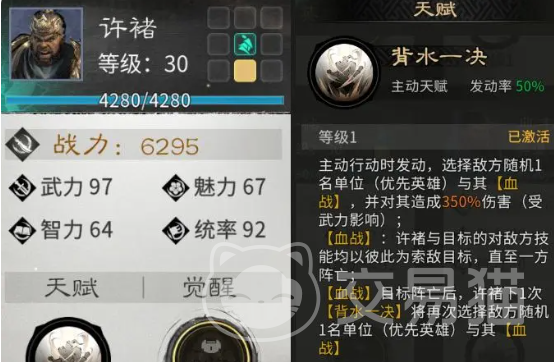 英雄配置建议采用“高爆发 强生存”双核结构:许褚承担核心单体输出职责,典韦负责前排承伤与反控保护,二者配合可有效压制敌方关键单位。技能优先解锁“攻守兼备”,其次选择“单枪匹马”。士兵搭配需兼顾前排坦度与后排输出,宝物选取以激活套装效果为首要目标,并优先装配至主力输出角色。