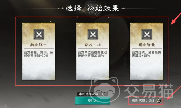首回合开启前,系统提供英雄、士兵、宝物、计策、兵略共5类初始效果供选择。其中英雄与士兵各需选定2项,首轮拥有3次免费刷新机会。建议优先点击右上角“查看全部”,完整浏览当前可选条目后再做决策,避免因盲目刷新错失关键增益。