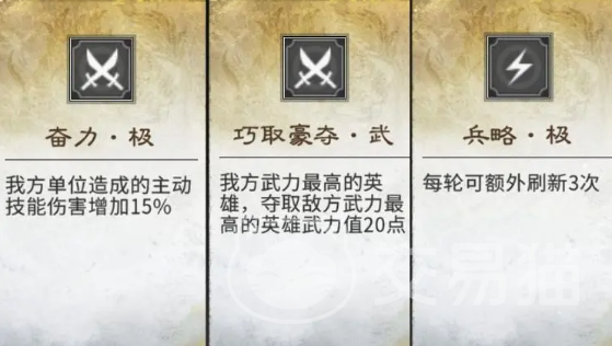初始效果推荐锁定三项:提升主动技能伤害15%的“奋力·极”、每轮可夺取敌方高武力单位20点武力值以增强容错的“豪夺·武”,以及赋予每轮额外3次刷新权限的“兵略·极”。三者协同可显著提升阵容构建弹性与实战稳定性。