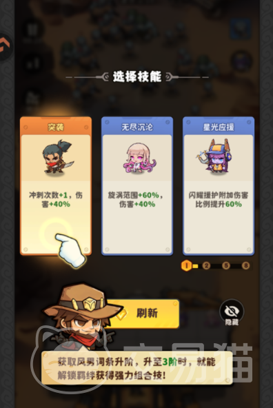 游戏融合Roguelike元素,每局挑战均生成差异化变量:僵尸出现序列、波次构成、地形障碍分布及特殊事件节点均为程序化随机。同时引入“战局加成”系统——开局前提供三组临时增益选项(如全体暴击率 15%、技能冷却-20%、金币收益 25%),玩家需结合当前英雄配置与资源储备进行最优决策。战斗中每次成功击杀均有概率掉落合成材料,用于角色升星、技能升级及装备精炼,进而解锁更高难度的僵尸编队挑战层级。