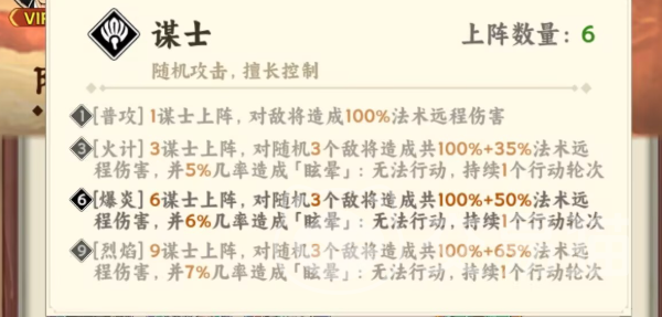 机制层面,每名谋士普攻可造成100%法术远程伤害;当上阵3名谋士时,将对随机三名敌方单位施加135%法伤,并附带5%眩晕概率;6人齐备后,伤害提升至150%,眩晕概率同步增至6%;若进一步达成9人烈焰羁绊,则法伤上限达165%,眩晕触发率升至7%。该数值模型确保了队伍在输出强度与控制覆盖率上的双重保障。