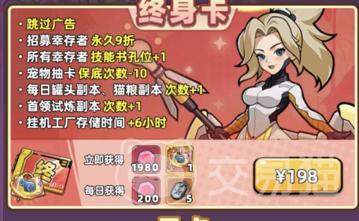 重氪玩家在完成首充与新手礼包后,建议依次开通周卡、月卡及终身卡。周卡提升钞票掉落上限与获取速度,并使挂机收益提高10%;月卡免除广告干扰,每日可在常驻卡池中进行1次自选招募,同时解锁3倍速战斗快进功能;终身卡提供永久广告跳过权限,幸存者招募享受9折优惠,宠物抽卡保底次数减少10次,且所有幸存者技能书额外增加1个孔位。