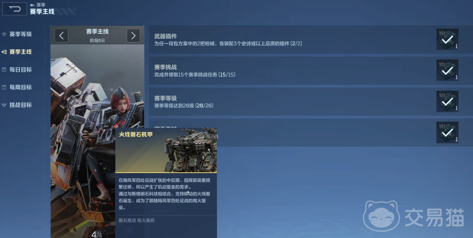 当前版本中,“火线磐石”机甲提供两种官方指定的免费获取路径。第一种方式为完成S0赛季主线任务第八阶段。该任务链深度嵌入游戏前期成长体系,全程无付费门槛,玩家只需按序推进剧情、达成各节点目标,即可在通关后即时领取该机甲。整个流程注重引导性与沉浸感,适合新老玩家平稳过渡至机甲作战阶段。