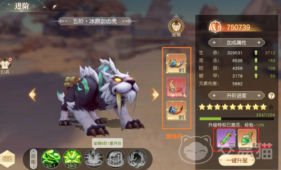 战力成长覆盖坐骑、翅膀、圣物、神兵、背饰、幻影共六大外观向养成模块,兼具视觉表现力与实质战力提升。各模块结构高度统一,以坐骑为例:支持升阶与属性丹佩戴两大核心操作。升阶需消耗进阶精华或祝福精华积累经验,经验满后提升星级,每累计10星可进1阶;属性丹分为橙色与红色两类,橙色丹主要通过圣团副本、魔王挑战、角斗场等日常玩法产出,属性加成稳定但幅度适中;红色丹具备更高阶属性组合与更强数值收益,但获取难度显著提升,通常需通过高难度活动或稀有掉落获得。