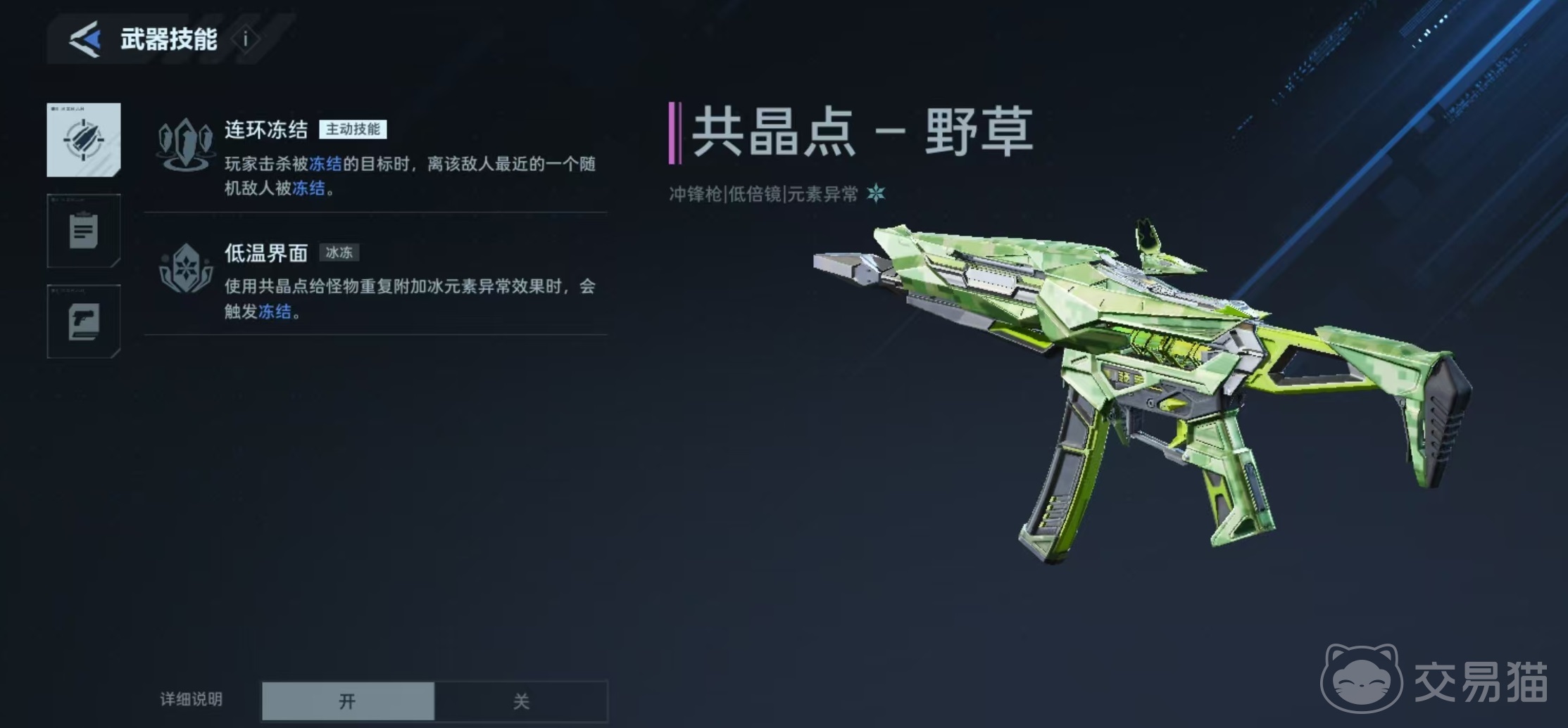 作为共晶点冲锋枪的衍生皮肤,其基础属性保持不变:单发伤害56,射速799,弹匣容量34,总弹量884,精准度71,稳定度52。高射速配合中等容弹量,使其在中近距离交火中具备快速压制能力。此外,该武器搭载两项专属技能:其一为“连环冻结”,当玩家击杀处于冻结状态的目标后,距离该目标最近的一名随机敌人将同步被冻结;其二为“低温界面”,在对同一目标多次施加冰元素异常效果时,可触发额外冻结判定。两项技能协同作用,构建起稳定的元素控制循环,在需要持续限制敌方行动的战斗场景中表现突出。