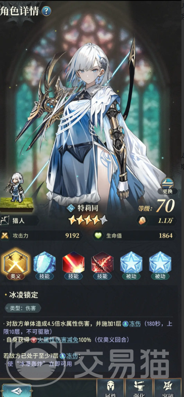 作为该体系无可替代的主C,“特莉同”是整套阵容运转的轴心。其核心技能“冰凌锁定”可对单体目标造成450%水属性倍率伤害,并施加一层持续180秒的冻伤状态。该状态最多叠加至10层,且具备不可驱散特性;每次释放该技能后,还将为自身赋予一层火属性完全免疫效果。