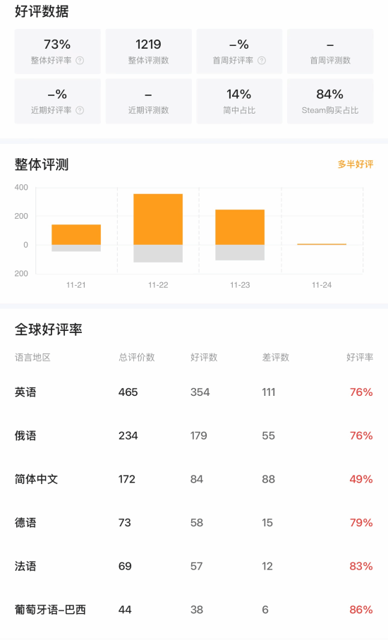 11月24日,豪华版玩家已经可以提前体验到本款游戏,而Steam目前整体评价为:“多半好评”,但游民商城目前显示,简中好评率仅49%,综合表现为“褒贬不一”。