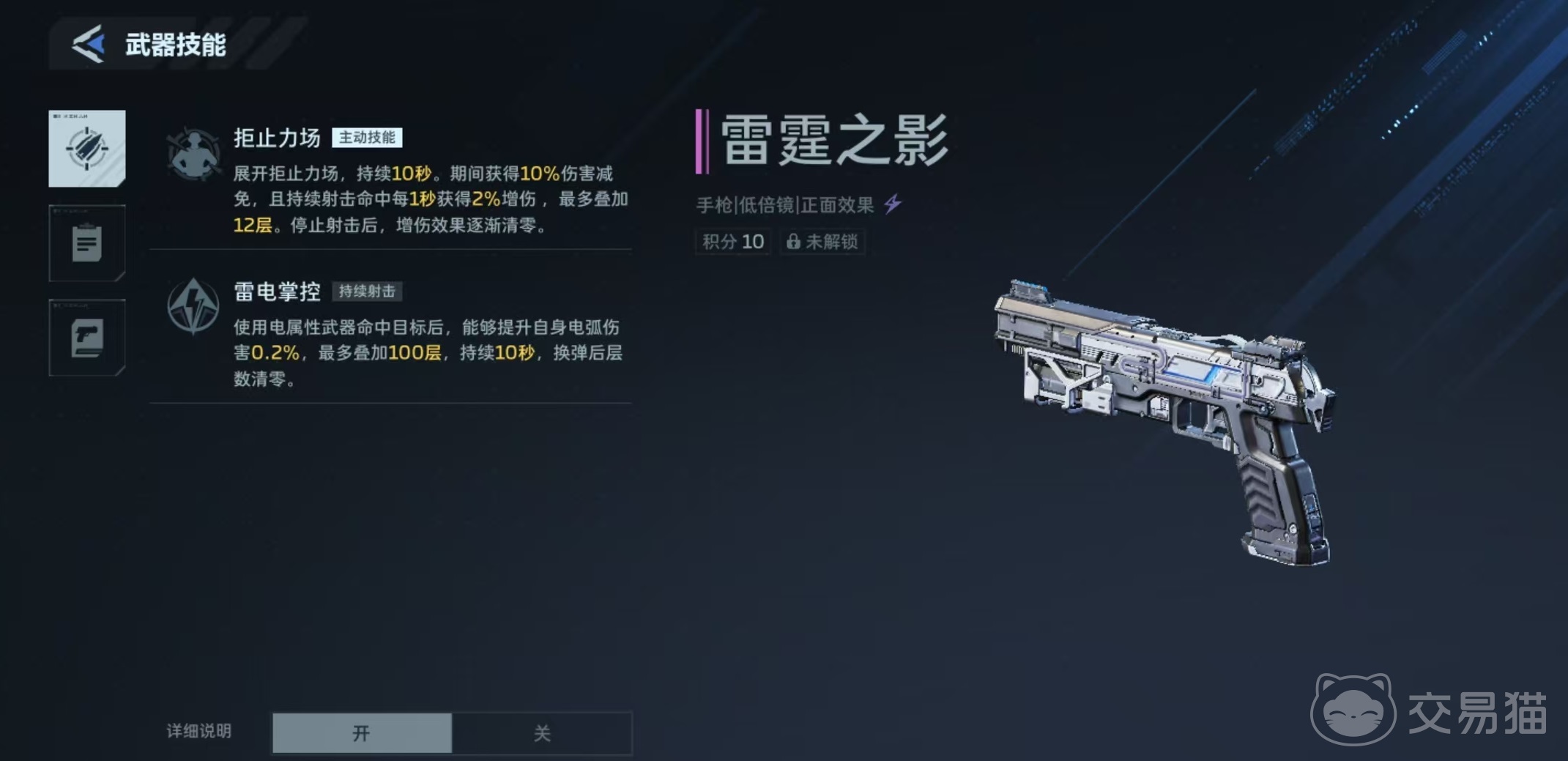 在《逆战未来》的武器体系中,手枪作为核心副武器类别,承担着补伤害、控节奏与战术衔接的重要作用。本期聚焦的“雷霆之影”,正是一款兼具性能与设计辨识度的高人气手枪。需特别注意的是,它与同系列的“雷霆999”虽共享银白色雷霆主题外观,但定位截然不同——前者为副武器手枪,后者为主武器突击步枪,二者不可混淆。