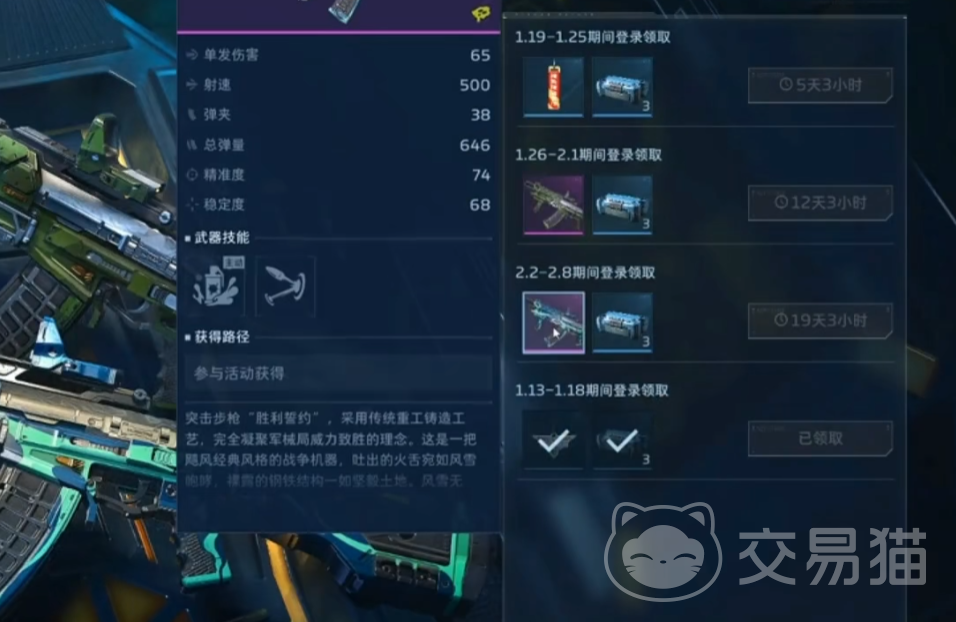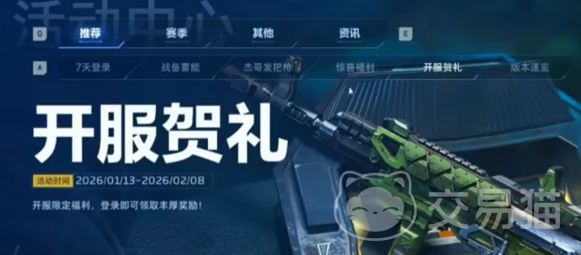 本次开服贺礼活动周期为1月13日至2月8日。活动首日登录即可领取紫色品质突击步枪——胜利誓约。该武器配备中倍光学瞄准镜,支持弹道预判与精准点射,基础伤害表现稳定;其主动技能可触发范围爆炸效果,适用于中近距离清场,有效应对集群敌人。