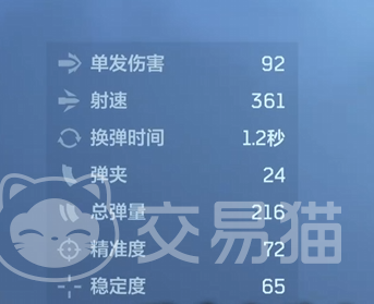 苔色暴风虽归类为低倍镜副武器,但性能远超常规手枪水准。其单发伤害固定为92点,射速达361发/分钟,换弹仅需1.2秒,弹匣容量24发,总携弹量216发;精准度72、稳定性65,各项参数均处于同类型武器前列,尤其适合需要快速反应与近距压制的战斗节奏。