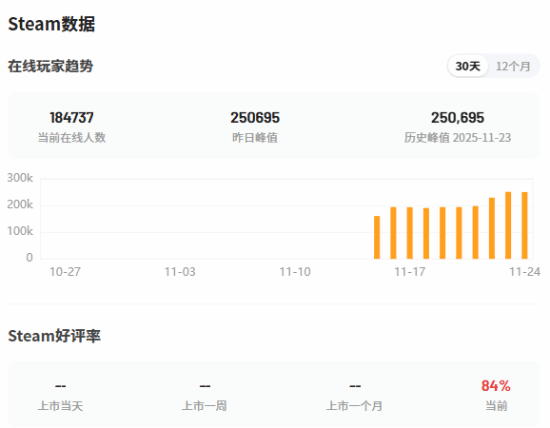 据Steam数据显示,网易武侠游戏《燕云十六声》在 Steam 上同时在线玩家达到了 25.1 万的历史新高,距离该平台发布仅一周多。
