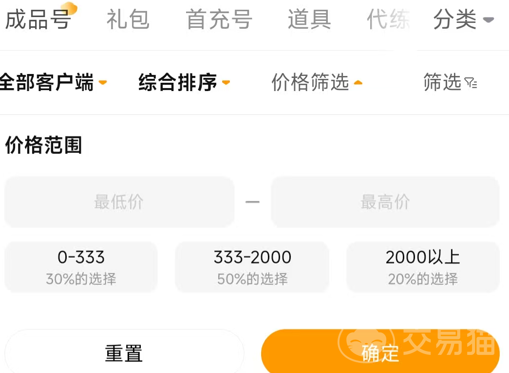 有些玩家在挑选的时候会发现价格有些接受不了,就想要选择一些价格低的账号,那么就可以使用价格筛选功能,该功能可以帮助玩家们锁定某一个价格区间,这样玩家们在挑选的时候就不怕价格浮动过大了,而且还有一个议价功能,当玩家选中喜欢账号的时候,觉得价格依旧太贵了,就可以通过议价功能跟商家协商,只要协商成功就可以低价购买了。
