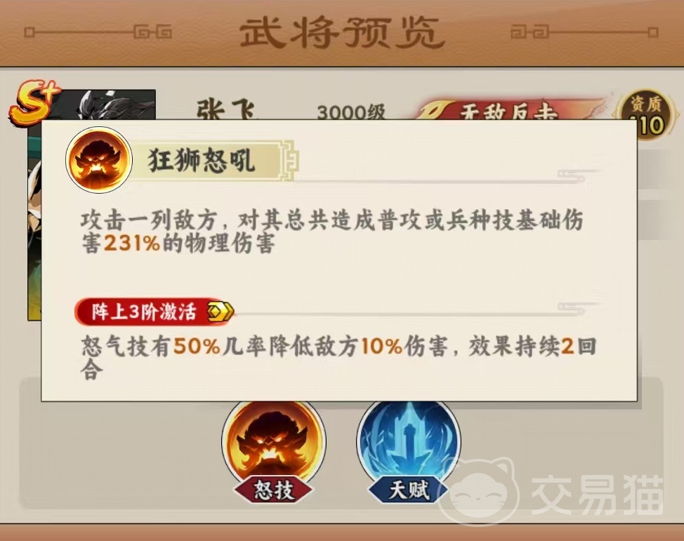 张飞的怒气技能可对一列敌方单位造成总计231%普攻或兵种技基础值的物理伤害。该技能附带概率性减伤效果——命中后有几率使目标全队伤害降低10%,持续两回合。随着星级提升,其天赋逐步解锁多重防御机制:当友方单位遭受敌方主动攻击时,张飞有概率发动追击;可提升同排武将物理防御属性;并按比例反弹所受近战与远程伤害;当自身生命首次跌至30%以下时,自动驱散所有控制状态,并获得一回合无敌效果。