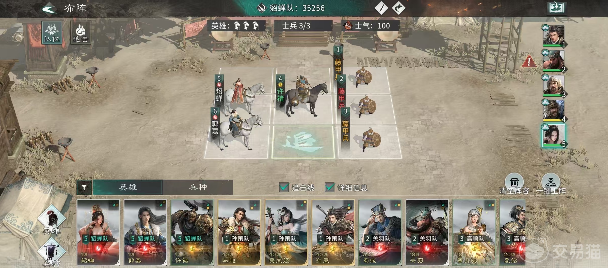 该阵容强调“精准打击、快速减员”,核心逻辑是优先清除敌方战力峰值单位,打破其阵型平衡。许褚承担主力输出职责,郭嘉提供技能频率增益与持续伤害补充,貂蝉则通过额外追击次数强化连击密度,三者形成伤害链闭环。