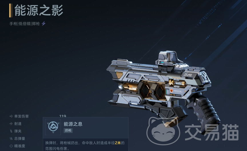 能源之影定位为电弧元素类半自动手枪,基础属性明确:单发伤害119点,初始载弹量18发,最大携弹量162发,并默认装配低倍率光学瞄具。其核心创新在于换弹机制——每次更换弹匣时,武器本体将被掷出,对落地点2米范围内目标施加闪电范围伤害。这一设定不仅拓展了战术维度,更使副武器具备了主动控场与清杂能力。