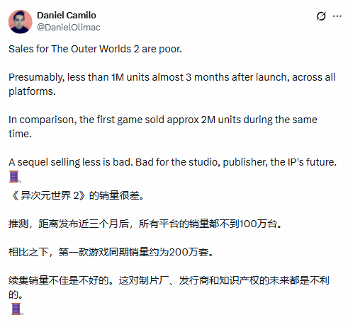 近日,知名游戏行业记者、顾问Daniel Camilo在社交媒体上发文表示,去年年末Xbox第一方备受关注的续作《天外世界2》在发售近三个月后,全平台销量疑似不足 100 万份。
