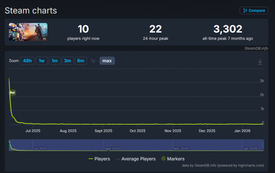 然而,这些营销手段似乎并未挽回颓势。根据SteamDB的数据,该游戏近期24小时的同时在线玩家峰值仅为22人,与其首发时的峰值3302人相去甚远。玩家数量在首发一周后便骤降至280人,随后持续下滑至当前水平。值得注意的是,此数据仅统计PC平台,游戏在PS5和Xbox Series X/S上的表现可能有所不同。