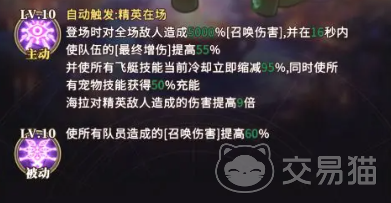 海拉的主动技能具备智能触发逻辑:当战场出现精英野怪时自动激活。技能生效后,立即对全场敌人造成5000%基础值的召唤伤害;同时赋予全队持续16秒的最终伤害提升效果,增幅达55%;此外,在她处于场上期间,所有飞艇技能的冷却时间缩短95%,且该减CD效果即时生效;所有宠物技能额外获得50%充能效率;针对精英单位,海拉造成的召唤伤害提升至原始数值的9倍。多重增益叠加,使其成为处理精英目标的最优解之一。