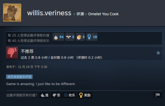 然而《Omelet You Cook》的这份完美纪录在前段时间最终被一条另类的差评打破——某位用户直言差评并非针对游戏质量,而是纯粹为了“标新立异”,甚至自己都承认“游戏很棒”。