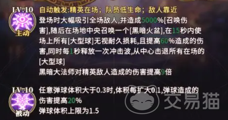黑暗大法师的核心定位为大型球特化辅助兼战术核心。其主动技能具备智能触发逻辑:当战场存在精英敌人、我方单位生命值低于安全阈值或敌方单位进入近身范围时自动激活。技能生效瞬间,角色将强制吸引全场仇恨,并对范围内所有敌人造成5000%基础攻击力的召唤伤害;随后在战场**生成持续15秒的黑暗火盆。该火盆提供三项关键增益:全场大型球耐久损耗归零、攻击伤害提升60%、每秒释放一次中心冲击波——该冲击波可使大型球对精英目标造成的伤害提升至原始数值的9倍。