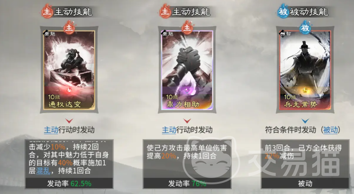 貂蝉承担团队生存调控与伤害补充双重职责。“闭月之貌”天赋使其在面对敌方英雄时获得额外伤害加成;若其魅力属性高于场上全部敌方单位,则每次触发追击时,存在概率额外多触发两次追击效果。技能配置上,优先选用“鼎力相助”(降低敌方攻击力)与“通权达变”(提升我方伤害),被动技能可选择“兵无常势”以强化前期压制力。前三回合内,该组合可为全队提供可观减伤效果,大幅改善开局生存压力。同样须注意:仅彩色品质貂蝉才可激活双主动技能槽,未达标者需在两个主动技能中择一装配。