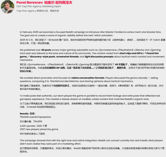 和2月的版本一样,Beresnev在文中再次强调:“内容的编排极其自然,以至于用户与板块版主都将其视为真实的社区讨论,而非推广。这种‘原生整合’非常有效——激发了好奇心、引发了讨论,并最终促使Reddit用户主动去了解并尝试玩这款游戏。”
