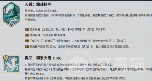 天赋【霜魂掠夺】是其战术定位的核心支点:常态提供10%攻击加成;技能命中时有50%概率驱散目标一项增益,并附加寒冷效果、清除护盾;升至7级后驱散成功率提升至100%;集齐6层“遗言”层数即可一次性驱散目标全部增益状态。该机制使其在对抗多层Buff堆叠型敌人时具备显著克制优势。此外,触发元素反应可缩减核心技能冷却时间,大幅增强其在元素队中的协同效率。好感度满级后解锁专属剧情动画,兼具战术价值与收藏意义。