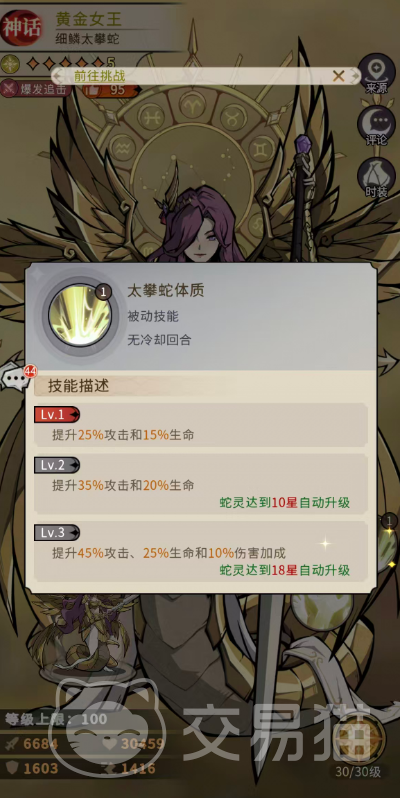 被动【太攀蛇体质】提供稳定属性成长:初始增加25%攻击与15%生命;10星激活二阶效果,提升至35%攻击与20%生命;18星时最终强化为45%攻击、25%生命及10%全伤害加成。