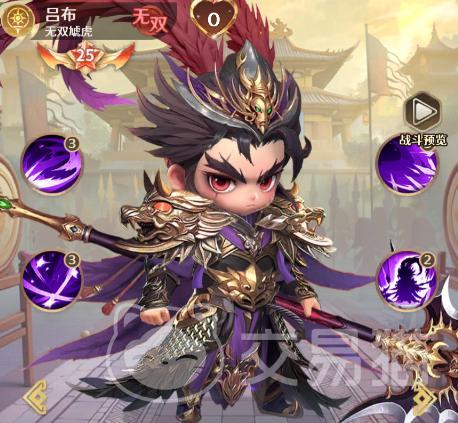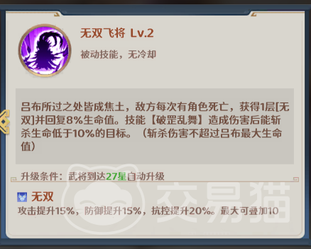 吕布作为核心物理输出,主动技与奥义均为范围伤害,具备智能索敌机制;目标数量越少,单体倍率越高。主动技附带禁疗效果,奥义则封锁敌方复活能力。被动技能随敌方阵亡次数持续恢复自身生命,并使主动技对血量低于10%的目标触发即死判定。