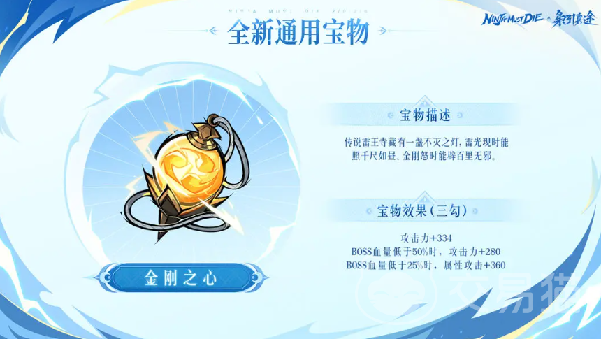 全新通用宝物【金刚之心】同步登场。该宝物灵感源自雷王寺秘藏不灭之灯,基础属性为攻击力 334;当BOSS血量低于50%时,额外提升攻击力280;血量低于25%时,进一步激活属性攻击 360效果。获取途径为“华光藏宝图”限时活动。
