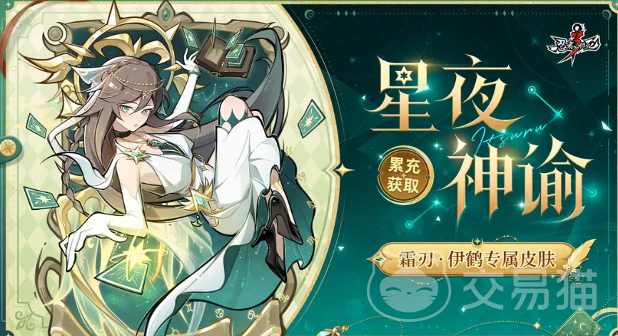 首推外观为伊鹤专属皮肤【星夜神谕】,该皮肤通过累计充值解锁。角色身着素雅白纱长裙,头戴星芒冠冕,周身环绕塔罗牌元素,整体设计融合神秘感与仪式感,凸显其神性气质。