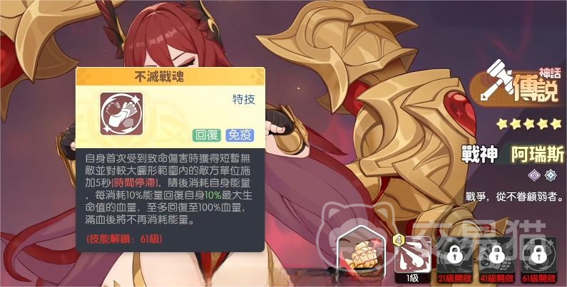 次选推荐:战神阿瑞斯。该幻灵拥有全战士职业中顶尖的生命成长曲线,并配备被动技“不灭战魂”——可在能量充足时触发短暂无敌状态,并随时间持续恢复生命值,直至回满。此机制不仅大幅提升单体生存上限,更能在BOSS爆发阶段有效规避即死伤害,是团队承伤与节奏调控的核心支点。