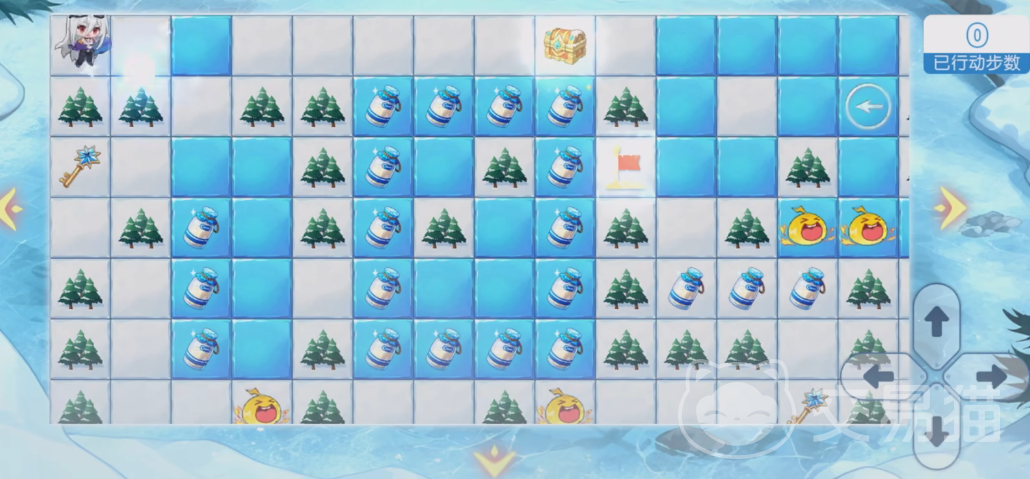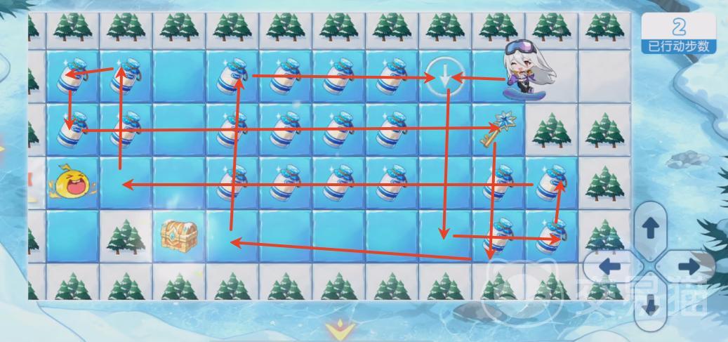 第一关地形简洁,重点在于理解冰面惯性——无阻挡时将一路滑至边界树木才停止。推荐起始向右滑行,绕过障碍后顺势上滑,精准停靠于左上角奶瓶位置,再调整方向完成剩余两点收集,最后直抵终点。