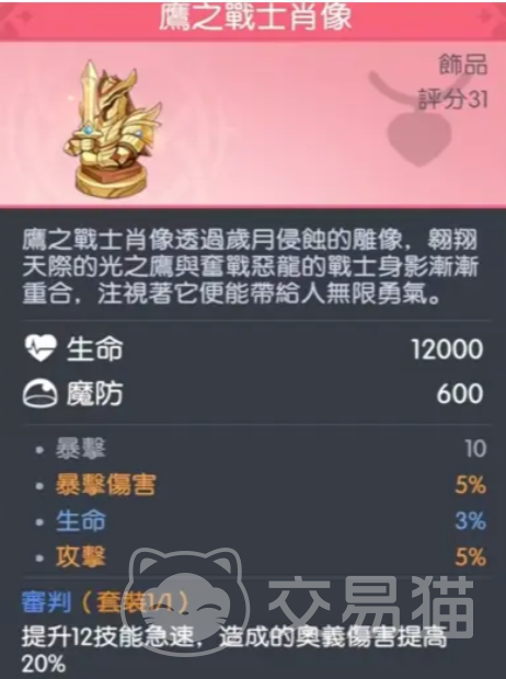 装备搭配方面,武器首选「最后的低语」,提供20%攻击力加成,并在每次攻击时无视目标12%物理防御与魔法防御;若暂未获取,可选用「无尽」类暴击率与暴击伤害双增型武器作为过渡。饰品推荐「肖像」,同步提升奥义伤害与攻击速度,强化炎魔的节奏掌控能力。