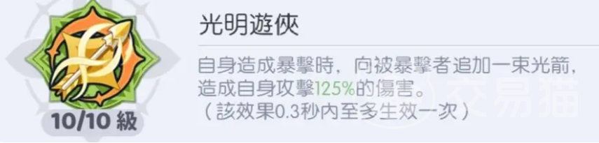 进一步分析协同性,「光明游侠」职业效果为:角色暴击命中时,自动追加一束光箭,造成等同于自身攻击力125%的额外伤害。此机制与炎魔高频释放奥义、触发多段攻击的特性天然契合,能显著放大单次爆发窗口内的总伤量。