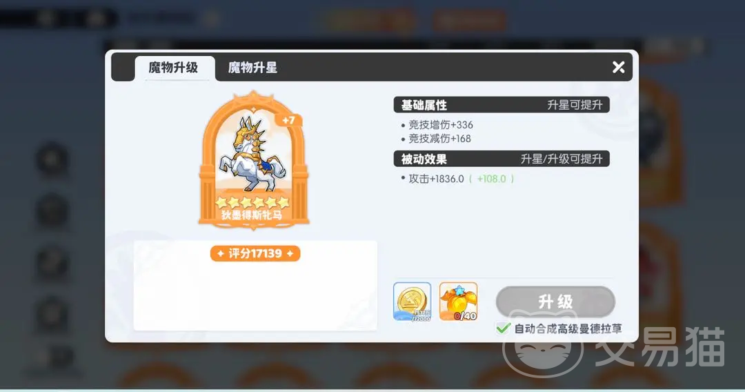 1、等级养成。魔物等级提升可增强被动效果数值,每升1级,被动增幅约提升10%。例如黑龙初始暴击加成为200,升至10级后可达400。升级消耗统一资源“曼德拉草”,分初、中、高、特四级;除特级需活动或商店获取外,其余均可通过魔物炼制概率产出,亦支持合成。养成建议:优先将主力魔物(含黄金搭档)升至3级,再同步推进至6级、9级;10级因特级材料稀缺,可暂缓突破。