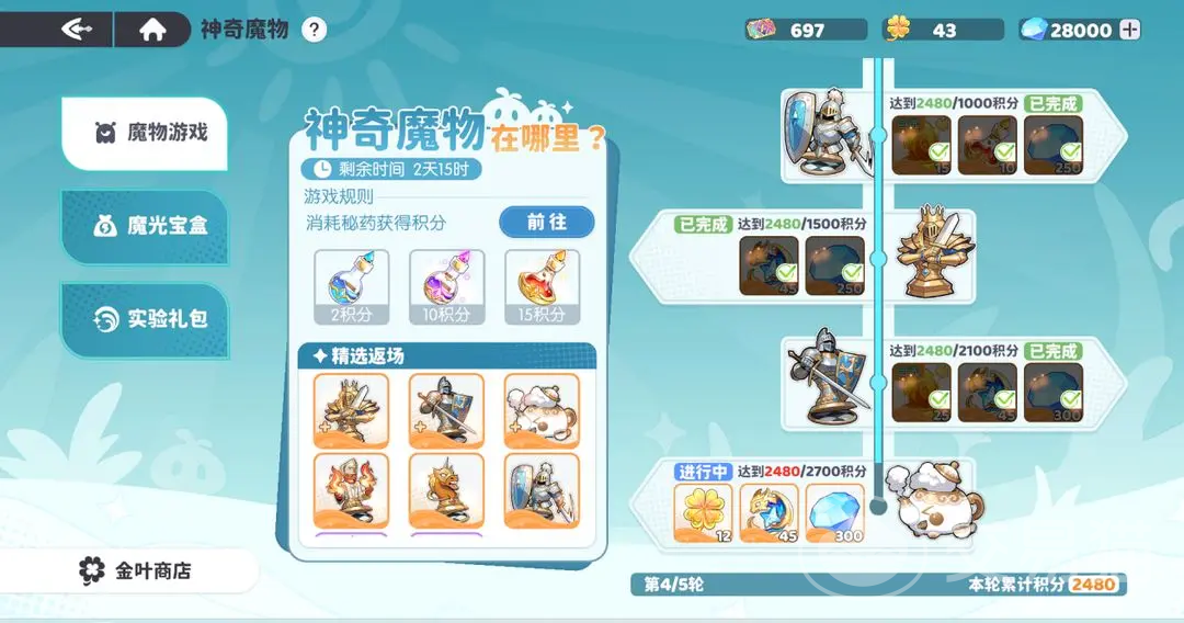 魔物主要获取途径为“魔物炼制”,是日常资源投入的核心循环。配合每周轮换的“神奇魔物在哪里”主题活动,玩家可在限定周期内抽取当期UP魔物或复刻魔物,同时获得关键货币金叶子。参与该活动需消耗红色命运魔药,当期UP池中包含新魔物首发及历史高价值魔物返场,建议根据自身战力缺口合理规划抽取节奏。