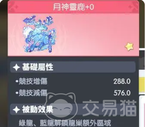 3、月神灵鹿:竞技增伤288点,竞技减伤576点,在防御向加成中表现突出;被动支持绿龙、蓝龙进入龙巢扩展区域。