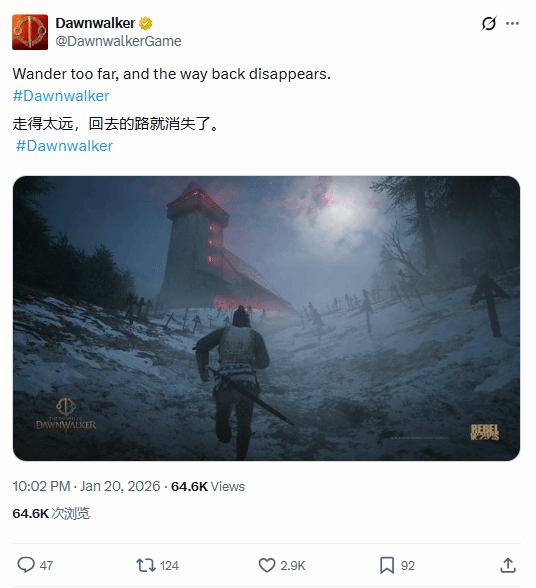 据外媒Playground报道,由CDPR前员工组成,近期正在开发吸血鬼动作RPG游戏《黎明行者之血》的Rebel Wolves工作室,在社交媒体公布了一张充满氛围感的beta测试截图,展示了一座阴森的塔楼矗立在布满墓碑的积雪山丘上。图片配文神秘莫测:“走得太远,归途便会消失。”