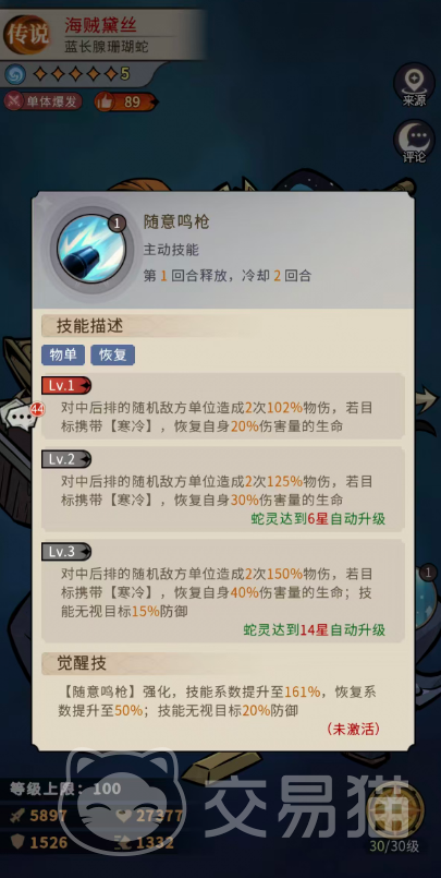 一技能【随意鸣枪】是海贼黛丝的核心物理恢复技。释放时对中后排随机一名敌方单位发动两次连续攻击,基础伤害为每次102%物理攻击力。当目标处于寒冷状态时,她可按本次总伤害的20%恢复自身生命值。该技能随星级提升持续强化:6星时单次伤害升至125%,寒冷触发下的吸血比例提升至30%;14星时单次伤害达150%,吸血比例进一步增至40%,并新增“无视目标15%防御”的特效。这一设计使她在对抗低防脆皮单位时具备极强穿透力,同时依托寒冷状态实现稳定续航,形成“打即回”的战斗节奏。