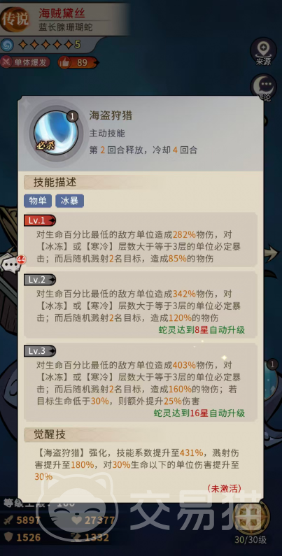 二技能【海盗狩猎】为必杀技,主打精准斩杀与冰系扩散。初始效果为锁定当前生命百分比最低的敌方单位,造成282%物理伤害;若目标已拥有3层及以上冰冻或寒冷效果,则必定暴击。此外,该技能在命中后会随机溅射至另外2名敌人,各造成85%物理伤害。星级成长路径明确:8星时主目标伤害提升至342%,溅射伤害同步增强至120%;16星时达到满阶强度——主目标伤害403%,溅射伤害160%,且对满足寒冷层数条件的目标仍保持100%暴击率。值得注意的是,当被锁定目标生命值低于30%时,该技能还将额外获得25%伤害加成;觉醒后主目标伤害上限可达431%,溅射伤害达180%,低血量增益提升至30%。