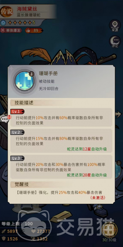 另一关键被动【珊瑚手册】侧重生存与输出稳定性。行动前自动触发,提供10%攻击力加成,并有60%概率清除自身所有非控制类负面效果。12星时升级为15%攻击力加成与80%净化概率;20星达成完全体效果——行动前获得20%攻击力、30%暴击伤害提升,且100%清除全部非控制负面状态。配合【海盗狩猎】的必暴机制与多段溅射,可形成“先净化→再暴击→连锁清场”的高效输出链。尤其在高难副本中,该净化能力大幅降低被异常状态压制的风险,显著提升容错率与阵容兼容性。