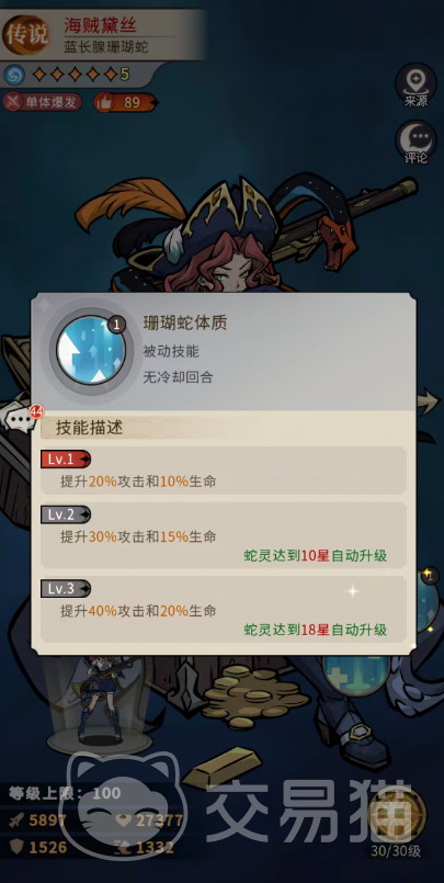 被动技能【珊瑚蛇体质】提供常驻属性加成:初始提升20%攻击力与10%最大生命值;10星时强化为30%攻击力与15%生命值;20星最终形态则稳定提供40%攻击力与20%生命值加成。该被动构成她持续作战能力的基础支撑。