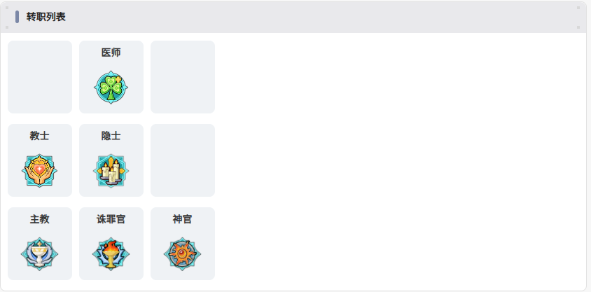 可供选择的正式转职职业共六种:医师、教士、隐士、主教、诛罪官、神官。各职业在治疗量增幅、技能冷却缩减、护盾强度、群体增益范围等方面存在差异化定位,例如医师偏向单体急救,主教强化全队减伤覆盖率,而神官则在持续治疗与驱散抗性上表现突出。玩家应结合自身主力角色属性、队伍配置短板及目标副本机制综合判断。